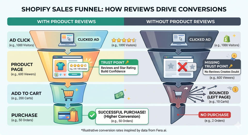 The mechanism plays out identically across channels. A Facebook ad or Google Shopping listing sends a shopper to your product page. They scan for reviews in the first 10 seconds. If the reviews are there — with photos, a clear rating breakdown, and verified badges — the confidence threshold gets crossed and they buy. If the page shows no reviews, most leave. The ad spend was identical in both scenarios. The review infrastructure was not.